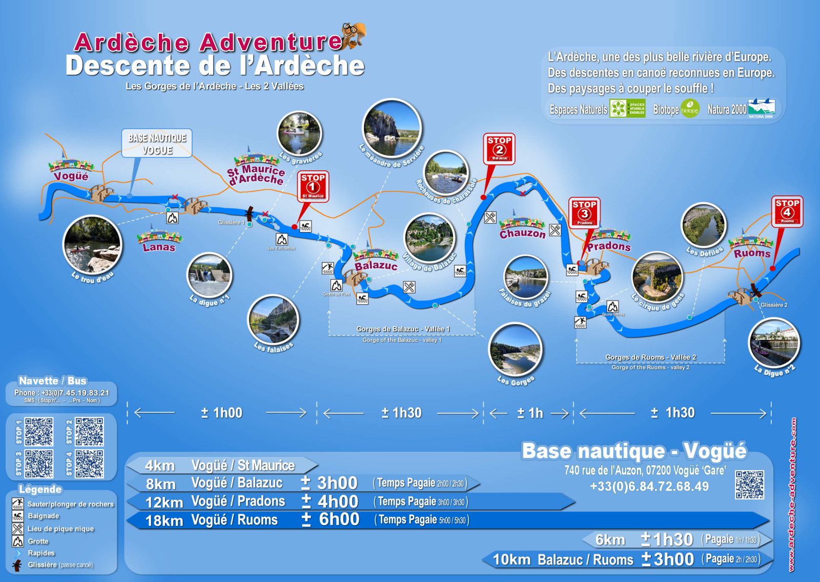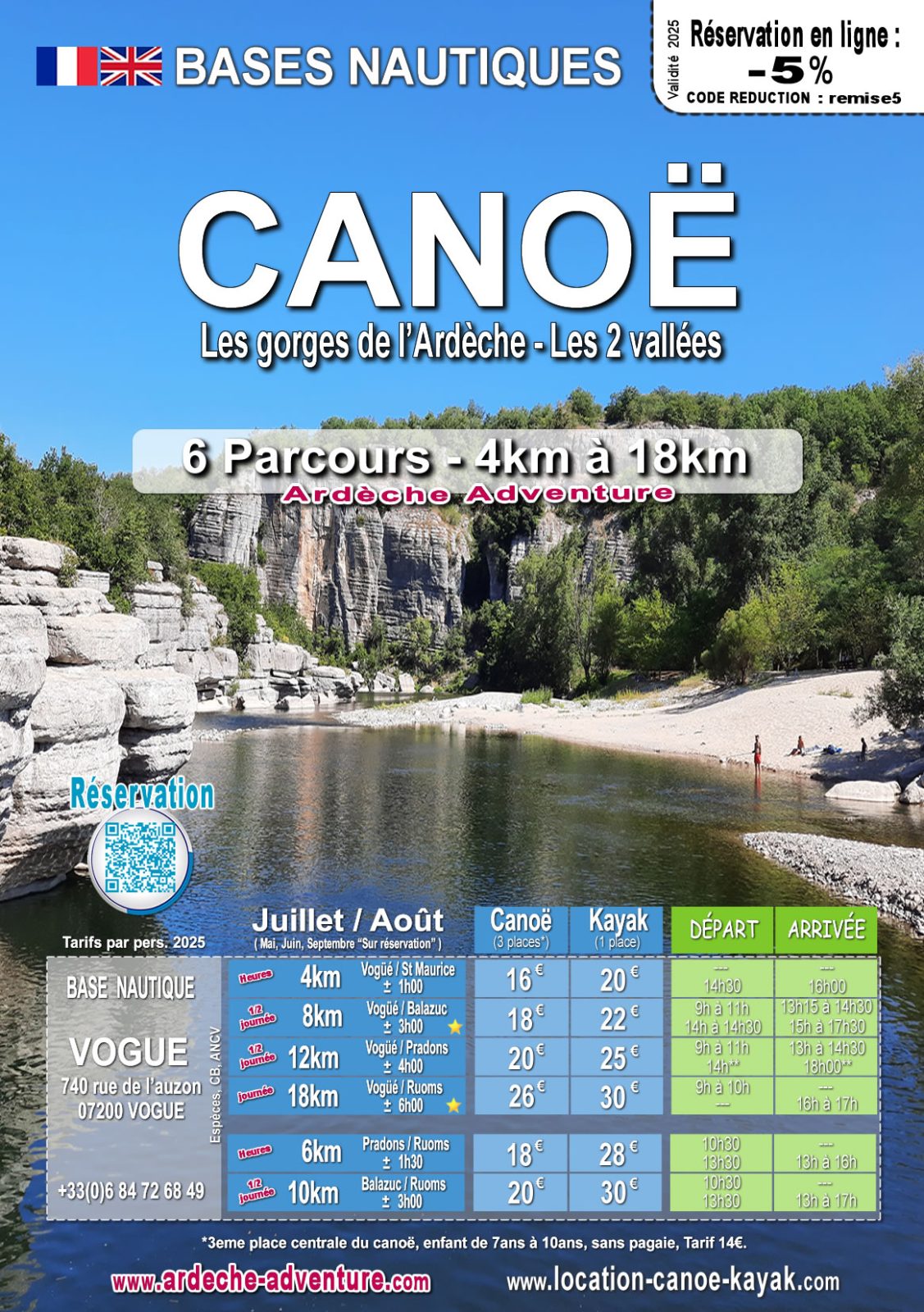 Partez à la découverte des Gorges de l'Ardèche - les 2 vallées. Découvrir des falaises et des gorges calcaires vertigineuses, des plages de sable accessibles qu'en bateaux et pour le fun, passer des rapides tout au long de l'Ardèche. La descente de l'Ardèche est l’activité principale à faire en Ardèche ! L’Ardèche en Canoë ou Kayak c’est vivre une descente mythique au cœur d’une des plus belle Rivière d’Europe. La bases nautique de vogué proposer : - 6 parcours : 4km, 6km, 8km, 10km, 12km, 18km. - Tarifs attractifs spécial été... - Parking, navette retour, vestiaires, wc, etc... Gratuits Les départs ont lieu tous les jours sur Réservation. Débutants ou confirmés, nous vous proposons des parcours accessibles à tous, y compris aux plus jeunes. Nos bateaux peuvent recevoir 1, 2 ou 3 personnes (place centrale -10ans, petit gabarit). Profitez pleinement de l'Ardèche et vivez une aventure extraordinaire. La descente de l’Ardèche est une expérience qui restera à jamais gravée dans vos souvenirs… Consultez notre site internet pour plus d'informations et réservation online... Notre équipe est là pour vous conseiller et vous guider.
