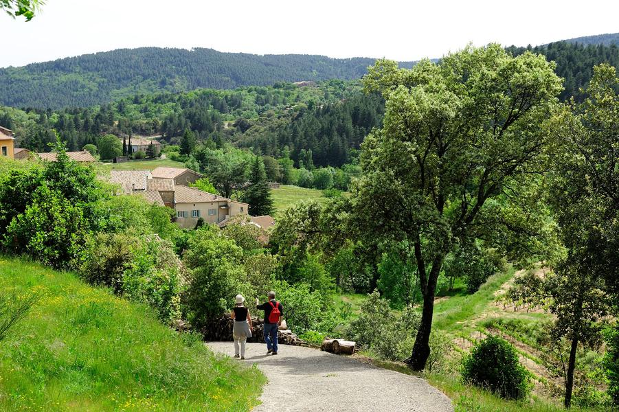 1. Le Pontet : [Joannas 3.9 km] Traversez le hameau de Mourier et continuez à suivre la route jusqu’à Vermale. Dans le virage, montez par le chemin goudronné sur votre droite, et continuez sur le sentier. Au croisement des chemins, poursuivez sur la draille en face. A la route, tournez à gauche puis traversez le hameau de Champ Clos par la gauche. A 300 m de la dernière maison, empruntez le chemin qui monte sur votre droite et redescend dans les pins et les chênes. Suivez le chemin ombragé qui rejoint la Vermalette en longeant des vignes. Gagnez le hameau par la route à droite, passez sous les maisons et longez les vignes sur quelques mètres. Empruntez la draille sur votre droite qui descend puis remonte dans les chênes verts. Continuez à monter derrière la caravane sur un chemin pentu. Vous arrivez sur une piste, tournez à gauche pour rejoindre la route. Suivez la D24 sur la gauche sur 150 m et tournez à droite en direction de Chabrolin. A 400 m, prenez le chemin sur la gauche qui longe les vignes puis à droite.