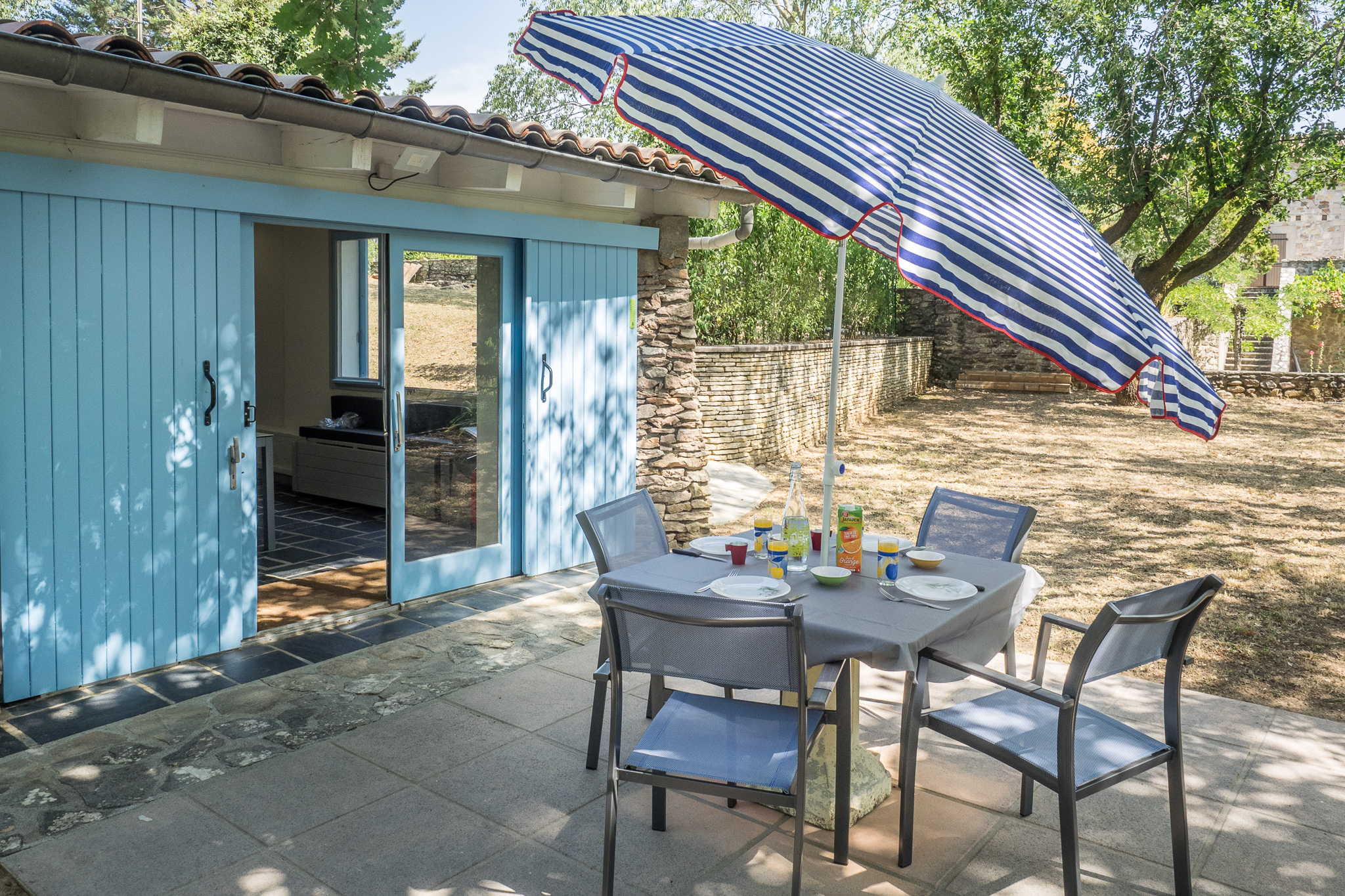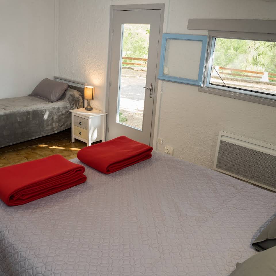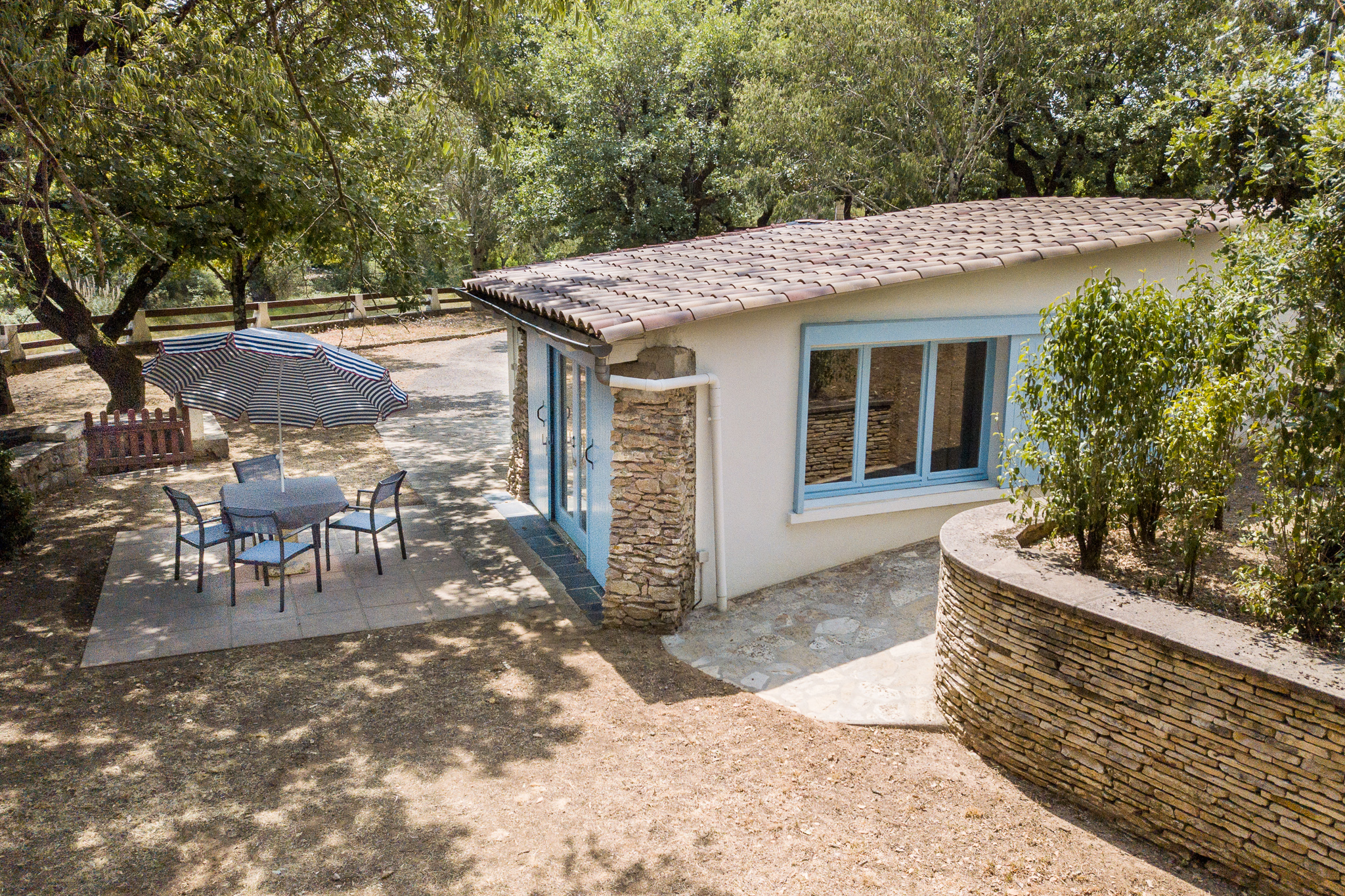 Petite maison de 3 à 4 personnes, à 700 m du village, sur terrain ombragé privatif d'environ 3000 m² avec petite rivière, terrasse, piscine (partagée avec les propriétaires si présents), terrasse couverte.