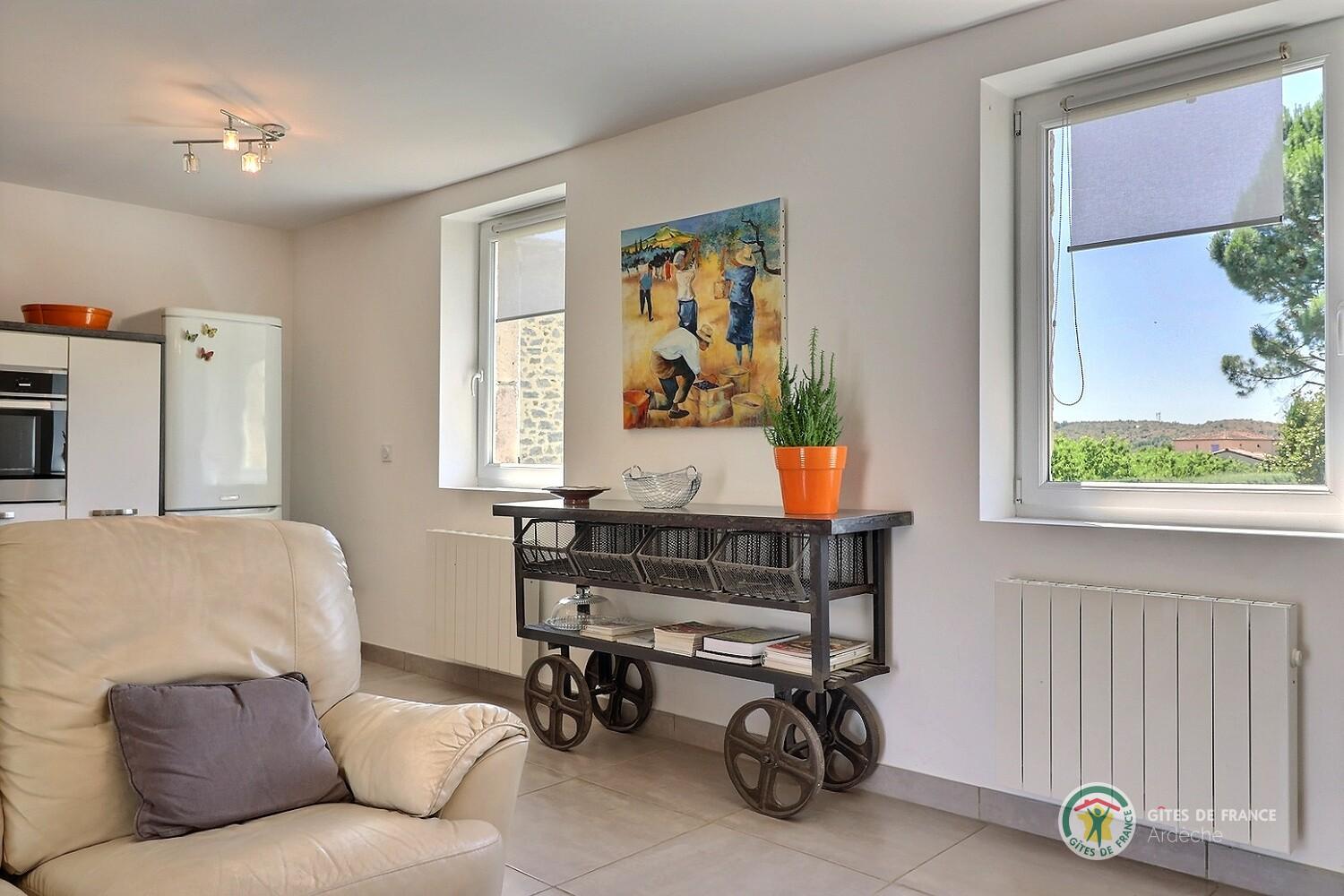 Le gîte dispose d'une belle pièce de vie réunissant un espace salon avec canapé, TV, internet, bibliothèque, un coin repas et une cuisine intégrée et toute équipée.
