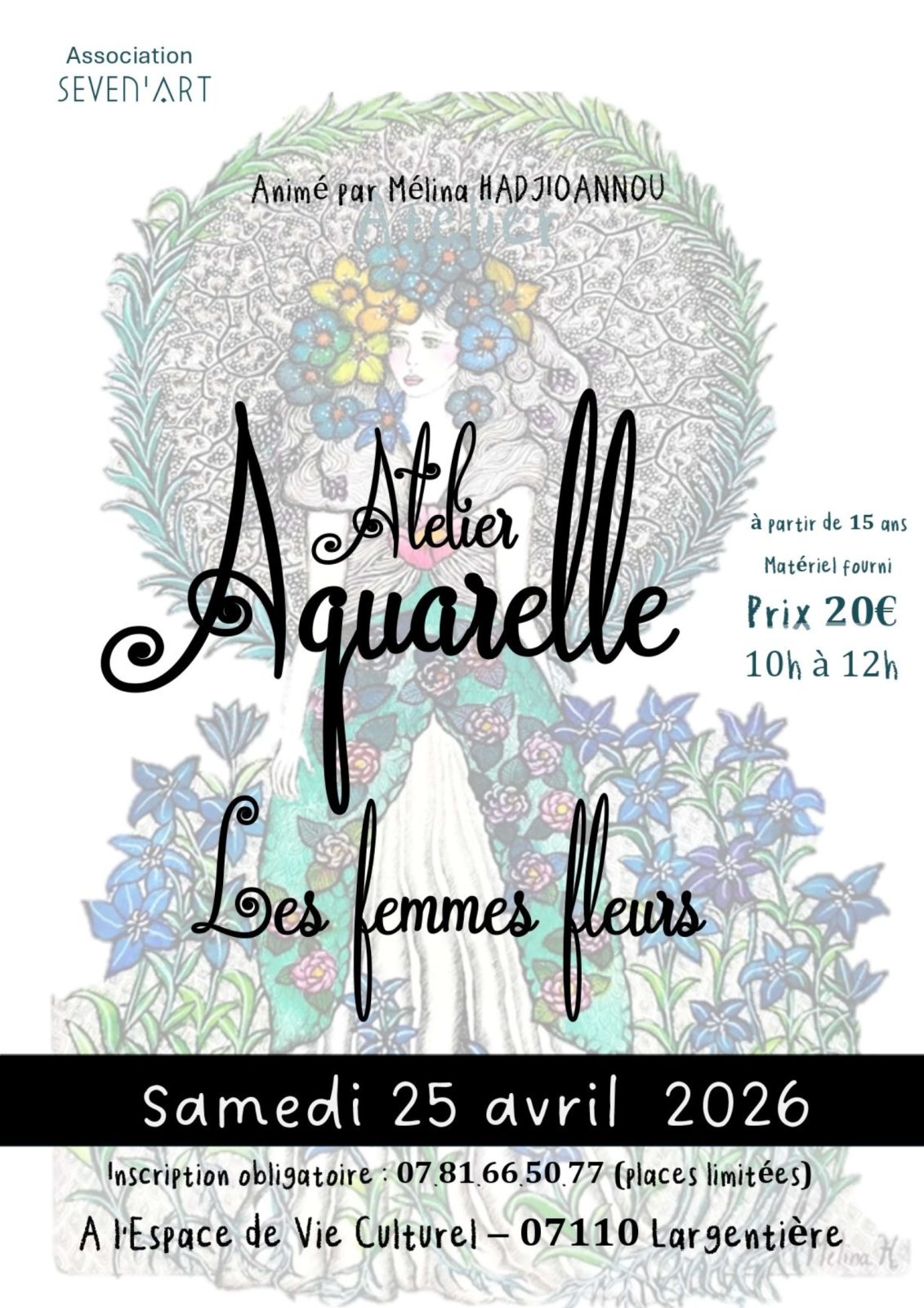 L’association Seven’Art vous propose : Atelier aquarelle avec Mélina Hadjioannou Illustratrice et auteure, Mélina Hadjioannou vous invite à explorer un univers poétique et délicat autour du thème : Les Femmes Fleurs À travers l’aquarelle, laissez libre cours à votre imagination pour créer une œuvre sensible et personnelle, inspirée par la nature et la féminité. À partir de 15 ans
