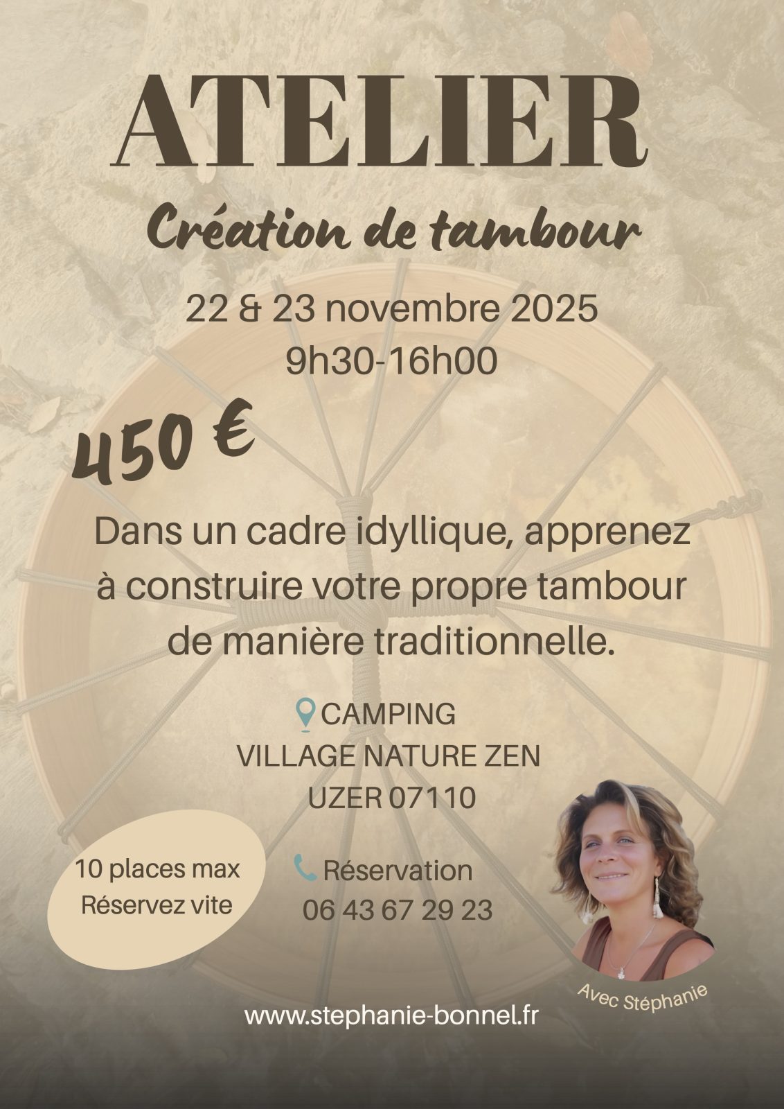 Je suis Stéphanie Bonnel, praticienne en soins chamaniques et énergétiques. Je vous propose un atelier unique, dans lequel vous allez créer votre propre tambour chamanique de manière traditionnelle. Guidé(e) pas à pas, vous apprendrez à fabriquer cet allié sacré, véritable compagnon de voyage intérieur et outil de guérison. Chaque tambour porte l’empreinte de celui ou celle qui l’a façonné, il devient un lien puissant entre vous et les mondes subtils. Un moment de transmission, de reliance et de créativité, pour repartir avec un tambour qui vous accompagnera dans vos pratiques, vos soins ou vos méditations