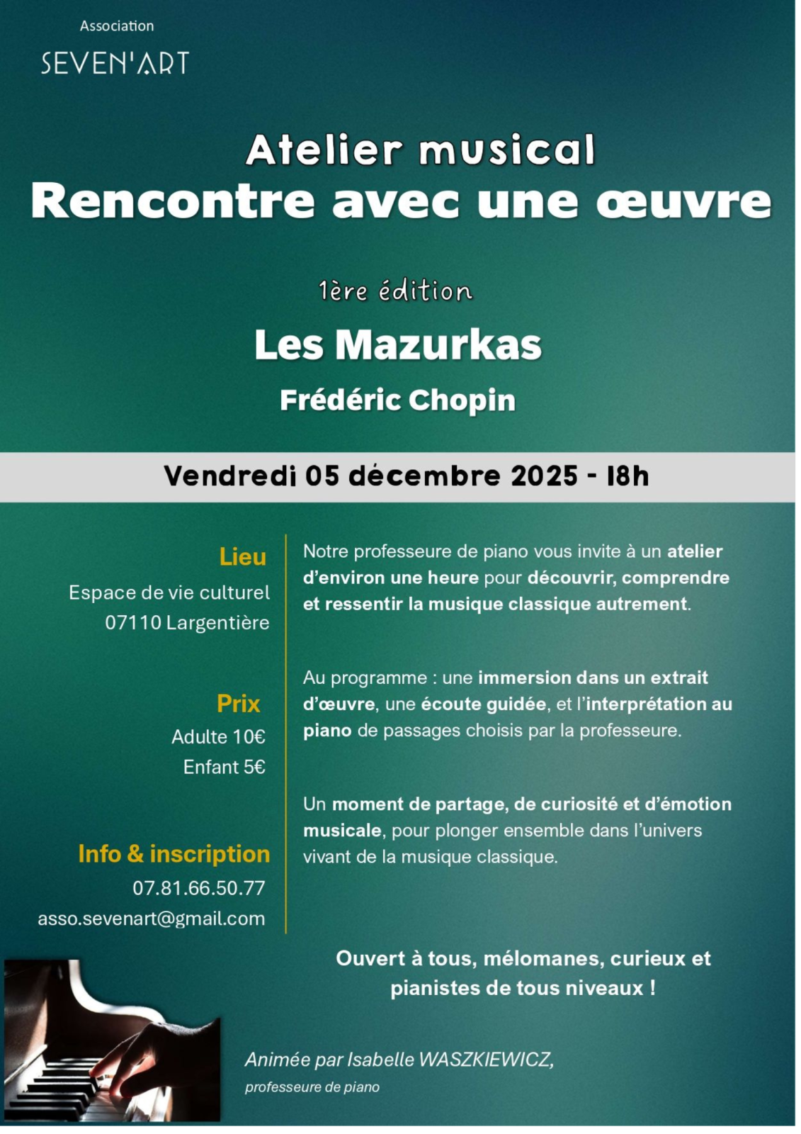 Au programme : une immersion dans un extrait d'oeuvre, une écoute guidée, et l'interprétation au piano de passages choisis par la professeure. Un moment de partage, de curiosité et d'émotion musicale, popur plonger ensemble dans l'univers vivant de la musique classique.