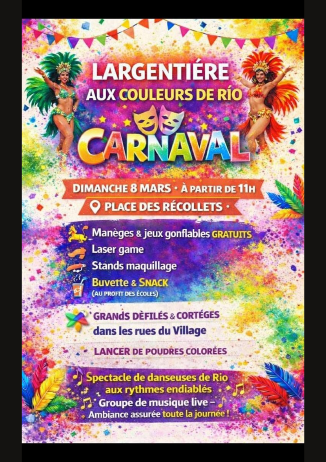 Un carnaval haut en couleur aux inspirations brésiliennes avec défilés festifs, lancer de poudres colorées, danseuses de Rio, musique live, manèges et animations pour toute la famille.