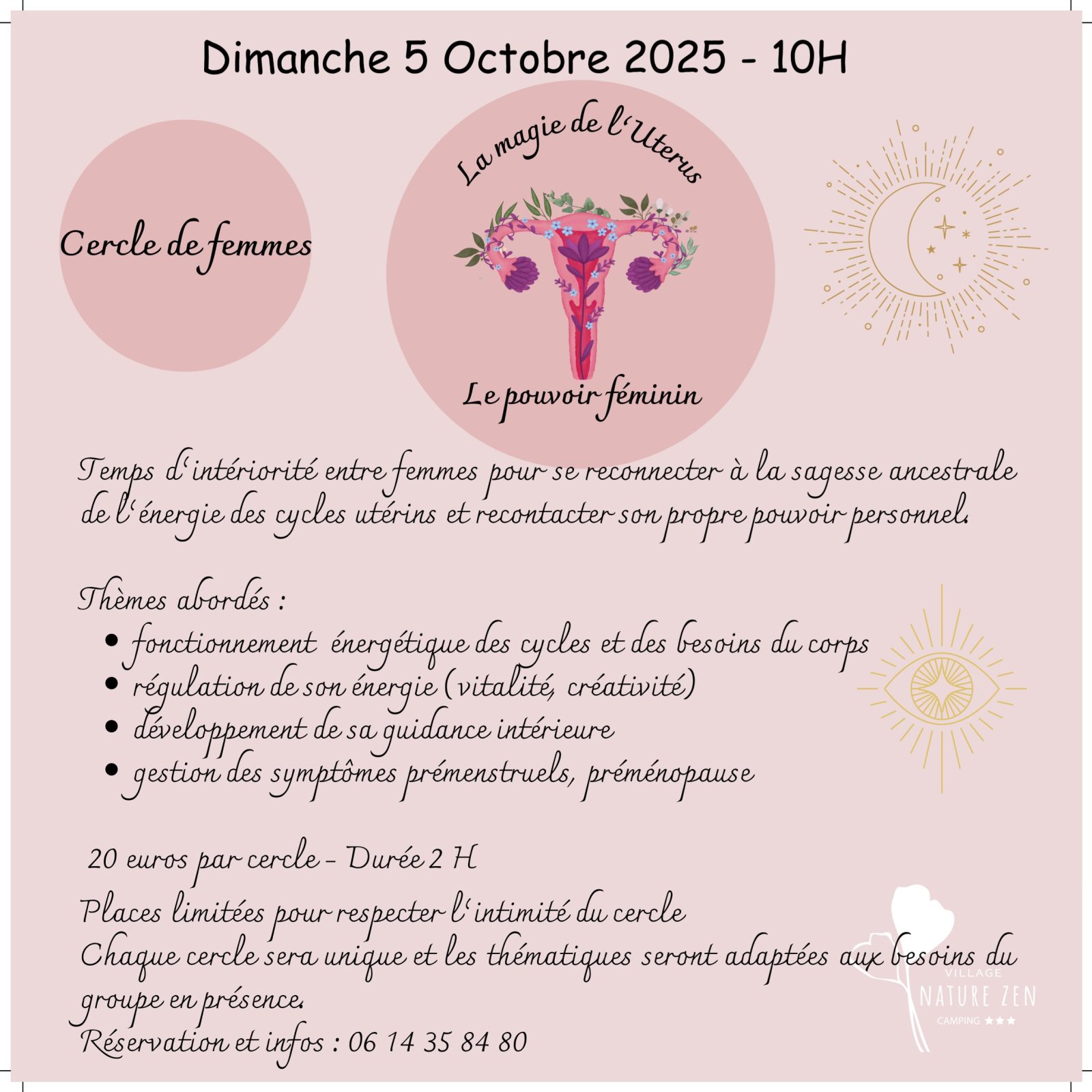 Temps d’intériorité entre femmes pour se reconnecter à la sagesse ancestrale de l’énergie des cycles utérins et recontacter son propre pouvoir personnel. Thèmes abordés : fonctionnement énergétique des cycles et des besoins du corps régulation de son énergie (vitalité, créativité) developpement de sa guidance intérieure gestion des symptômes prémenstruels, préménopause Places limitées pour respecter l’intimité du cercle Chaque cercle sera unique et les thématiques seront adaptées aux besoins du groupe en présence.