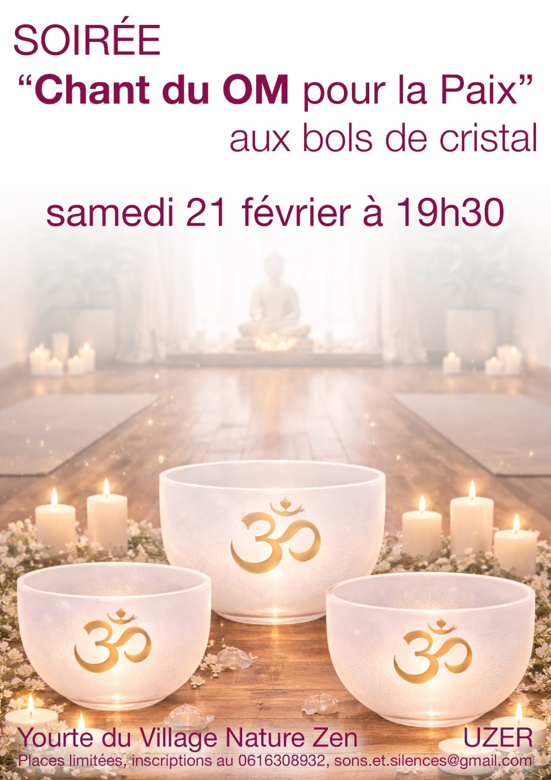 Soirée Sacrée pour la Paix dans le monde, en offrant votre plus beau “OM“ ! Venez vibrer ce Son universel accompagné des bols de cristal.