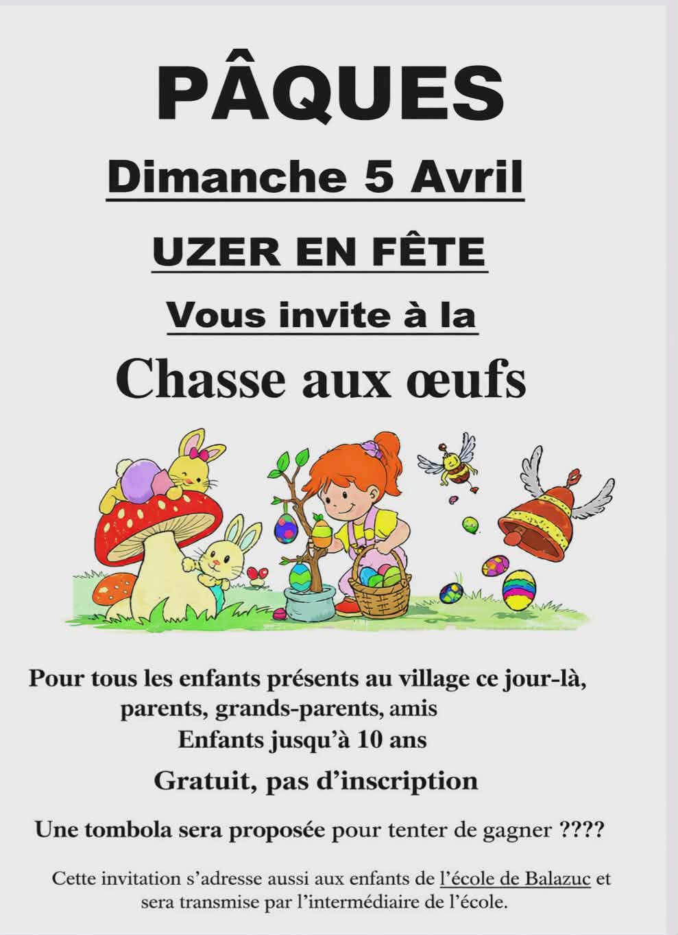 Uzer en Fête vous invite à la chasse aux œufs pour tous les enfants présents au village ce jour-là, parents, grands-parents, amis. Enfants jusqu'à 10 ans. Cette invitation s'adresse aux enfants de l'école de Balazuc et Uzer.
