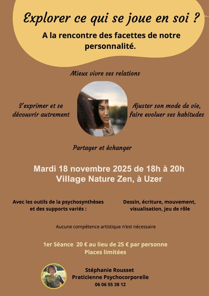 Ces ateliers offrent un espace bienveillant et vivant où chacun peut s’exprimer, ressentir, et se découvrir autrement, en lien avec les autres. C’est un temps pour ralentir, observer ce qui se joue en soi, et laisser émerger du nouveau. J’utilise une approche humaniste, la psychosynthèse. Elle aide à relier le corps, le mental et les émotions, dans une dynamique d’unité, de transformation et de sens. Plutôt que d’analyser, on cherche à expérimenter, ressentir et intégrer ce que l’on vit, avec douceur et curiosité. Pour cela, j’utilise des outils simples, accessibles et créatifs : dessin, écriture, mouvement, visualisation, jeu de rôle. Ces supports permettent d’explorer nos ressentis, nos contradictions, nos désirs profonds, tout en favorisant une meilleure connaissance de soi. Chaque atelier s’articule autour d’une thématique concrète, par exemple : Accueillir nos parts plus sensibles Clarifier une situation qui nous questionne Faire des choix qui nous correspondent vraiment Aucune compétence artistique n’est nécessaire — simplement l’envie d’explorer, de ressentir et de se découvrir autrement. Les rencontres se déroulent dans une atmosphère d’écoute, de respect et de légèreté, où chacun avance à son rythme.
