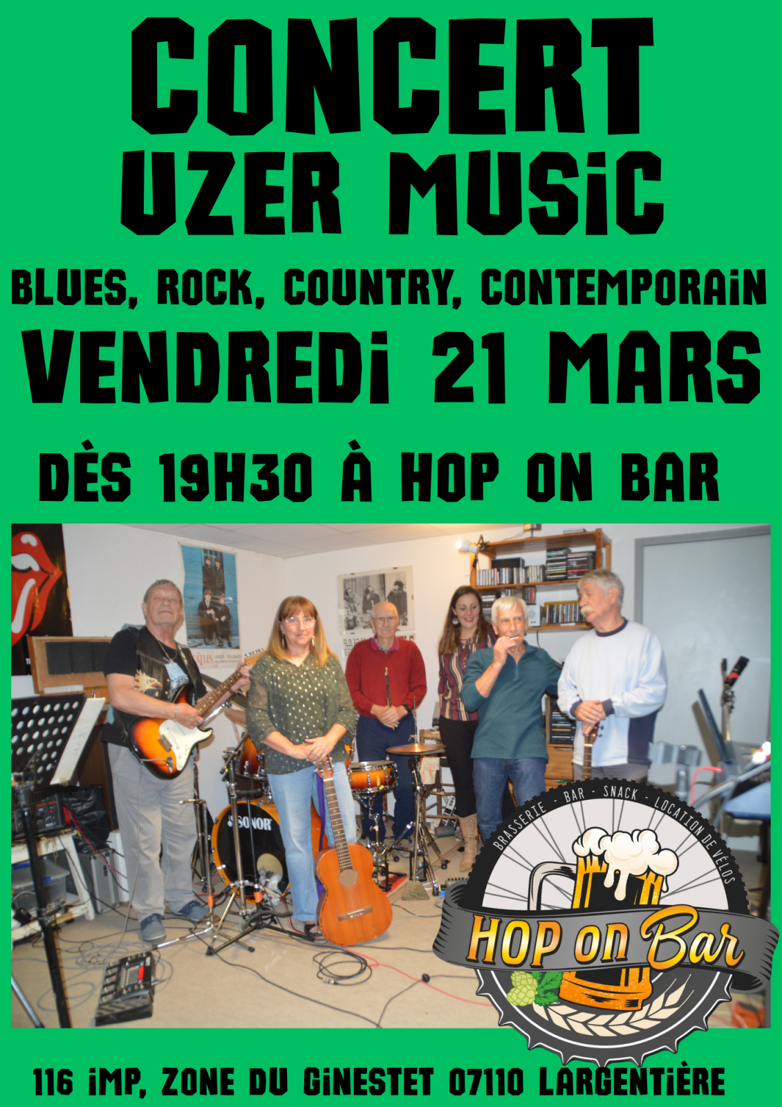 Ouverture À propos Tarifs Suggestions Karaoké Retour à la liste Soirée cochonnaille Dates Samedi 21 mars 2026 de 19h à 0h. Concert Uzer musique Blues, Rock, Country, Contemporain Langues parlées Français Labels & classements Concert Types Distractions et loisirs Thèmes Chant / Chanson Tarifs En accès libre Gratuit.