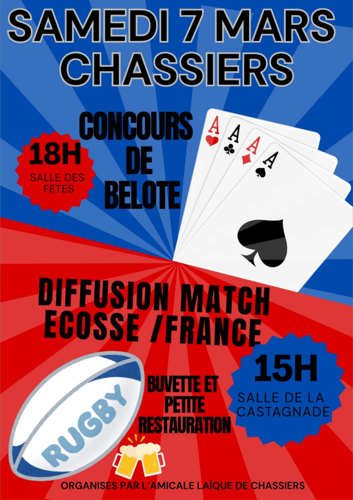 Après-midi et soirée conviviales autour d’un concours de belote suivi de la diffusion du match de rugby Écosse / France, avec buvette et petite restauration proposées sur place.