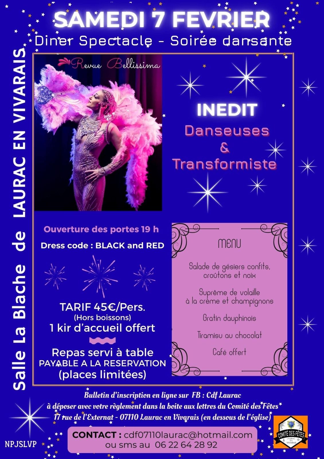 Diner spectacle "cabaret" suivi d’une soirée dansante animée par la troupe du spectacle. Ambiance festive et chaleureuse