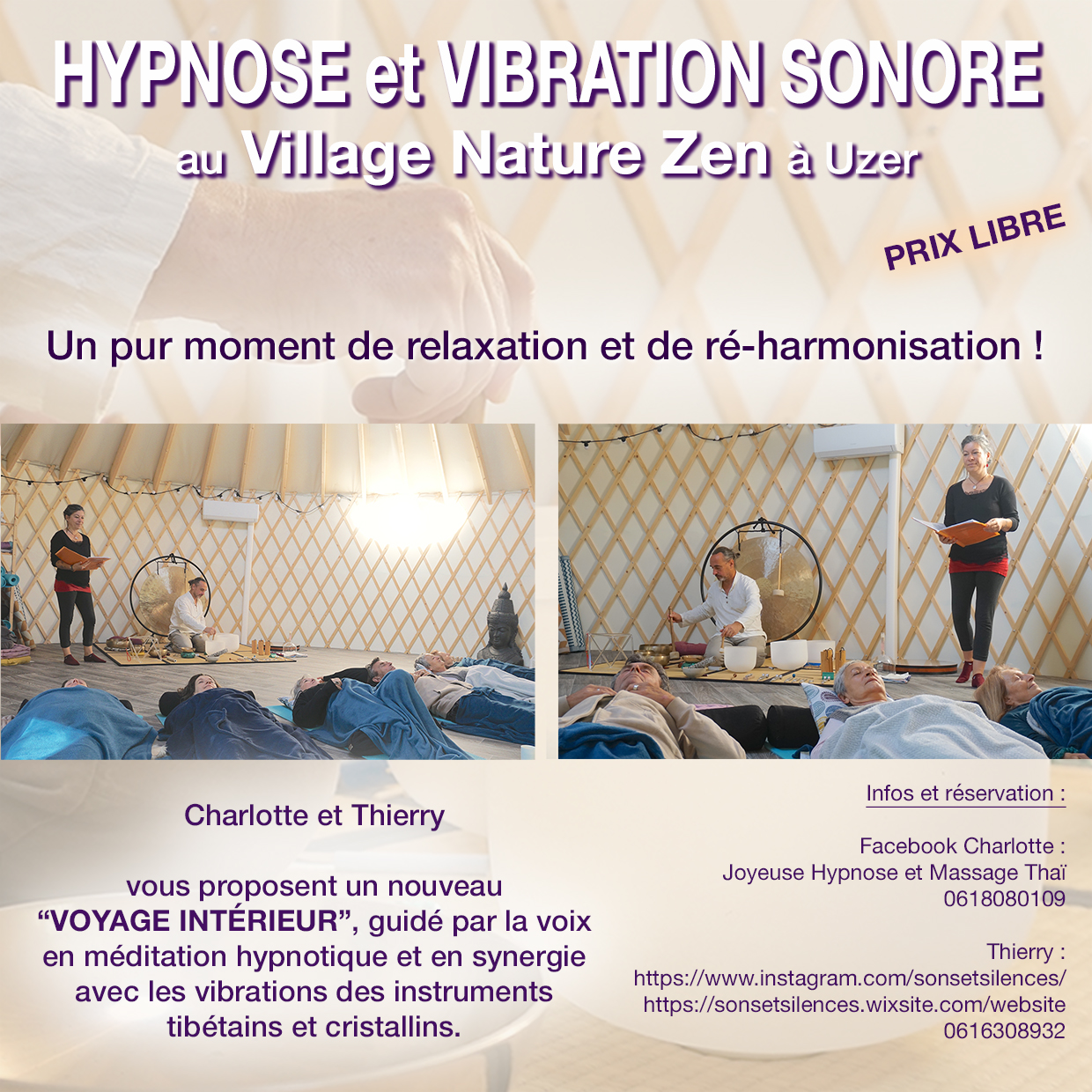 Charlotte Boulé et Thierry Brunet vous proposent un nouveau Voyage Intérieur, guidé par la voix en méditation hypnotique, en synergie avec les vibrations des instruments tibétains et cristallins.