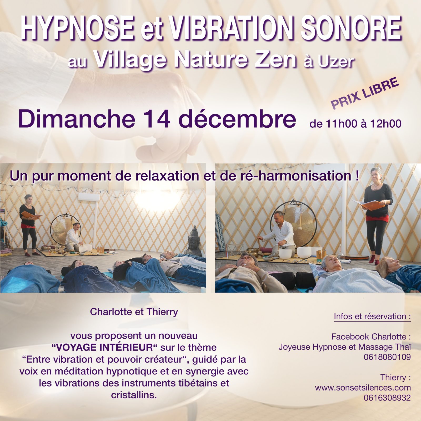 Charlotte Boulé et Thierry Brunet vous proposent un nouveau « VOYAGE INTÉRIEUR » sur le thème : «Entre vibration et pouvoir créateur», guidé par la voix en méditation hypnotique, en synergie avec les vibrations des instruments tibétains et cristallins. Un pur moment de relaxation et de ré-harmonisation.