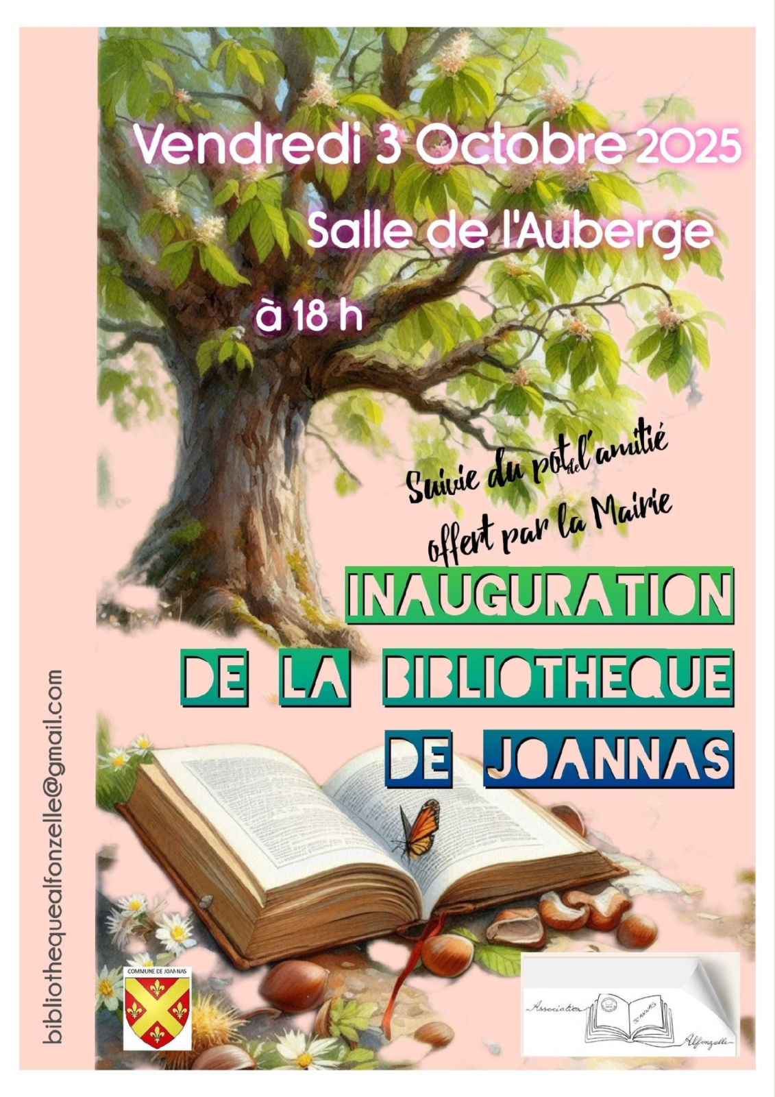 La commune de Joannas inaugure sa nouvelle bibliothèque. Cet événement festif sera l’occasion de découvrir ce nouveau lieu dédié à la lecture, à la culture et aux rencontres. La cérémonie sera suivie d’un pot de l’amitié offert par la mairie, dans une ambiance conviviale.