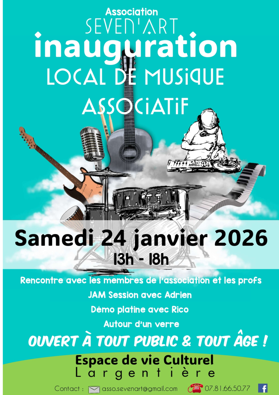 L’association Seven’Art vous invite à découvrir son nouveau local de musique associatif à l’occasion de son inauguration. Cet événement est l’occasion de rencontrer les membres de l’association ainsi que les professeurs, d’assister à une jam session animée par Adrien et à une démonstration de platines avec Rico. Un moment convivial et musical, ouvert à tous les publics et à tous les âges, pour découvrir le lieu, échanger et partager autour de la musique, le tout dans une ambiance détendue autour d’un verre.