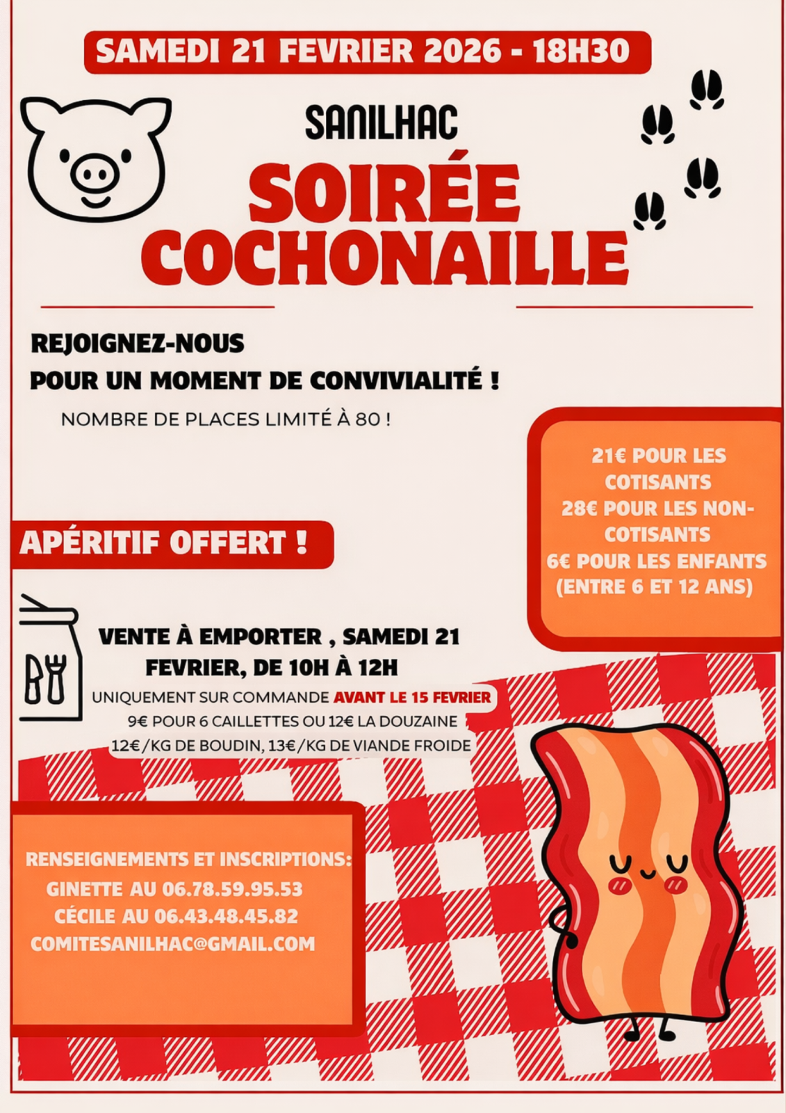 Soirée conviviale autour de la traditionnelle cochonnaille, avec apéritif offert, dans une ambiance chaleureuse et festive. Un moment de partage gourmand proposé par le comité des fêtes, sur réservation et dans la limite des places disponibles.