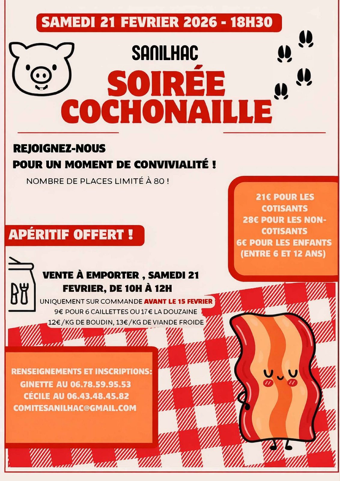 Le comité des fêtes de Sanilhac propose une soirée cochonnaille placée sous le signe de la convivialité et du partage. Au menu, des spécialités issues du cochon, préparées dans la plus pure tradition, accompagnées d’un apéritif offert pour bien lancer la soirée. Le nombre de places est limité à 80 personnes, la réservation est donc indispensable. Une vente à emporter est également proposée le samedi matin, uniquement sur commande passée avant le 15 février, avec au choix caillettes, boudin et viande froide.