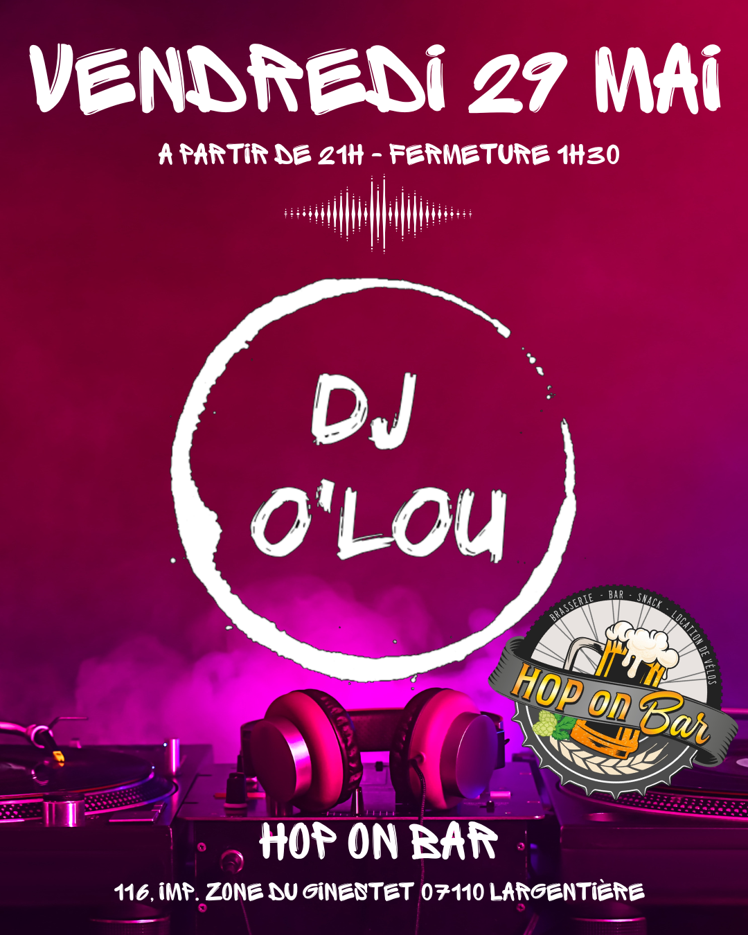 Ouverture À propos Tarifs Suggestions Soirée DJ au Hop on Bar Retour à la liste Karaoké Dates Vendredi 29 mai 2026 de 21h à 1h. Soirée DJ animé par DJ OLOU Langues parlées Français Labels & classements Soirée dansante Types Distractions et loisirs Thèmes DJ Tarifs En accès libre Gratuit.