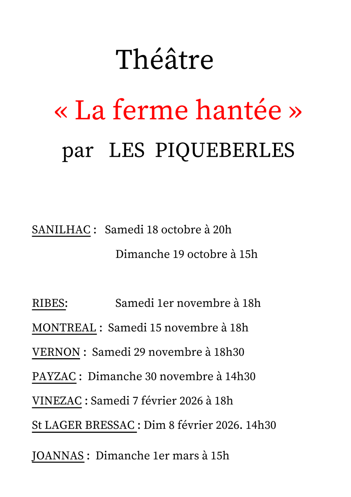 La troupe Les Piqueberles présente “La ferme hantée”, une pièce qui plonge les spectateurs dans une histoire pleine de rebondissements. Entre personnages hauts en couleur, frissons légers et humour accessible à tous, la pièce joue avec les codes du théâtre de divertissement. Chaque représentation est l’occasion de découvrir l’univers joyeusement farfelu imaginé par la troupe, dans une atmosphère conviviale et chaleureuse.