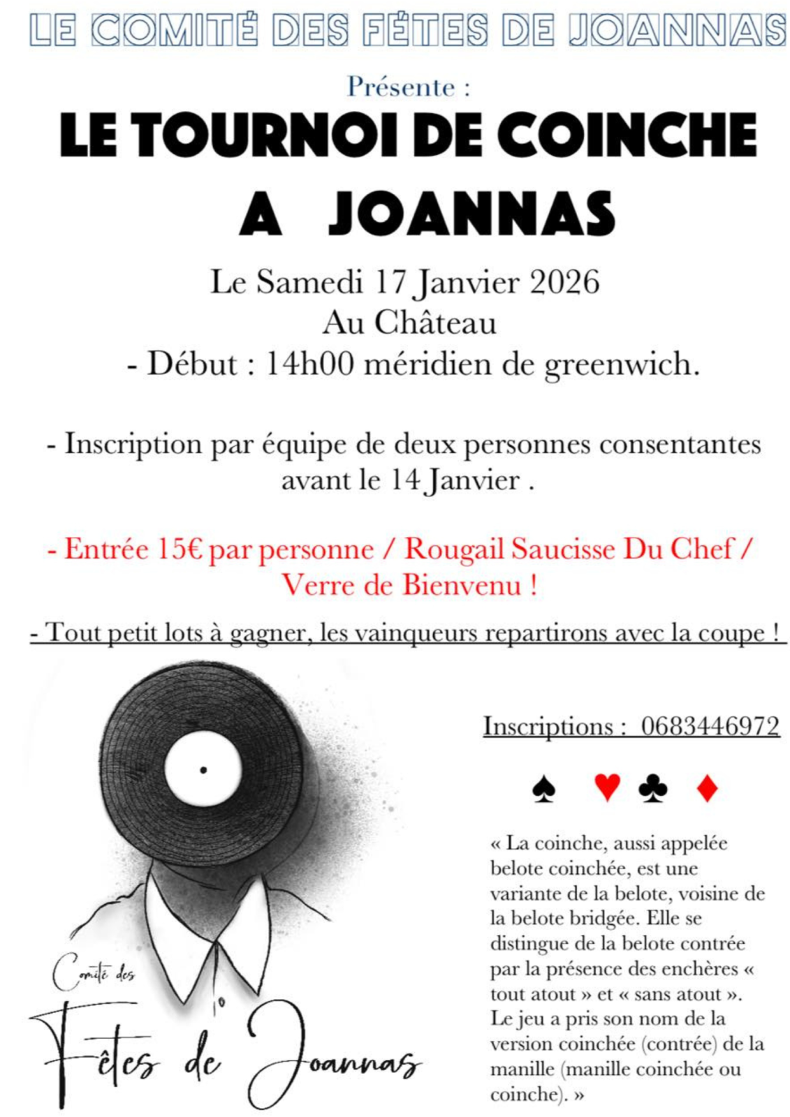 Tournoi convivial de coinche ouvert aux équipes de deux joueurs, mêlant esprit de compétition et moment gourmand, avec repas inclus, verre de bienvenue et petits lots à gagner pour les participants.